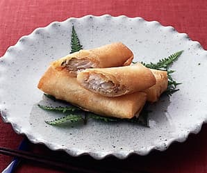 器に小麦粉適宜を水で溶いておく。春巻きの皮の手前にたらと野菜を1/10量のせてパプリカ少々をふる。春巻きの皮の向こう側の端に水で溶いた小麦粉を薄く塗り、手前からきっちりと巻き、巻き終わりを手で押さえて留める。残りも同様に包む。揚げ油を中温(170℃。小麦粉を同量の水で溶いたものを数滴落とすと、鍋底近くまで沈んですぐに浮き上がる程度)に熱し、春巻きをきつね色になるまで揚げる。