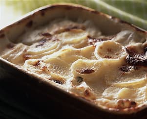 鍋に牛乳を入れる。じゃがいもは皮をむいてかるく洗い、薄切りにして切ったものから鍋に加えていく。にんにくは薄切りにする。オーブンを200℃に温める。
