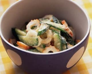 きゅうりは縦に2等分し、薄く斜め切りにする。塩少々をふってしばらくおき、水けを絞る。ちくわは小口から薄切りにする。