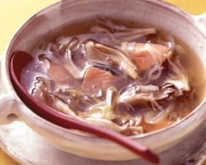 鍋に、だし汁と、しょうゆ大さじ1/2を入れて強火にかけ、煮立ったら鮭を加えて中火にし、まいたけ、ねぎを入れ、アクを取って2~3分煮る。味をみて、好みで塩少々を加える。水溶き片栗粉を、もう一度かき混ぜてから回し入れ、再び煮立ったら火を止める。