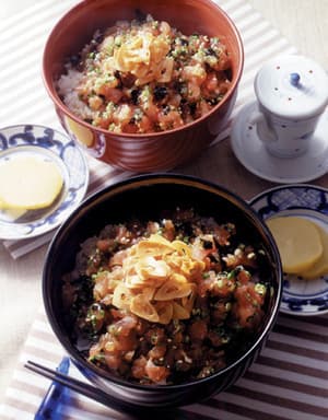 ご飯を器に盛り、まぐろとにんにくをのせる。にんにくを炒めたごま油をさらに熱し、しょうゆ大さじ2とともに、食べる直前にかける。