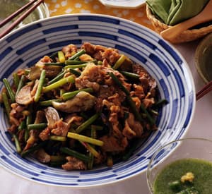 鍋に、下ゆで用の湯をたっぷりと沸かしはじめる。豚肉は幅4cmに切り、ざっとほぐす。にんにくの茎は、長さ4cmに切る。なすはへたを切って皮をところどころむき、縦半分に切ってから幅8mmの斜め切りにする。