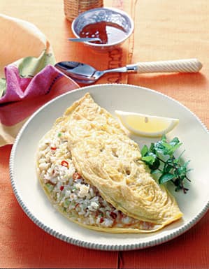 フライ返しで卵を半分に折ってご飯にかぶせ、そのまますべらせるようにして皿に盛る。残りの1つも同様にして作る。レモンとあればミントの葉を添え、レモンを絞りかけながらいただく。