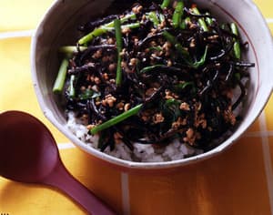 万能ねぎを加え、しんなりとしたら水溶き片栗粉をもう一度混ぜて加えてとろみをつけ、ごま油大さじ1をふって火を止める。器に温かいご飯を盛り、ひじきをかける。