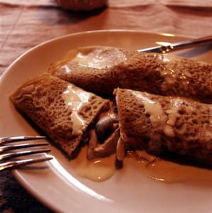 クレープ(下記参照)で1のきのこの1/2量を巻く。残りも同様に作って、皿に盛り、鍋に残ったクリームを回しかける。