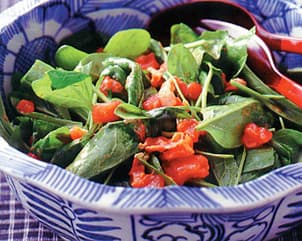 フライパンにオリーブオイルを熱し、ベーコンを入れて強火で炒める。ベーコンがカリッと香ばしくなってきたら、トマトを加え、塩、こしょう各少々をふってざっと炒め合わせる。ほうれん草にかけ、混ぜながら、熱いうちにいただく。