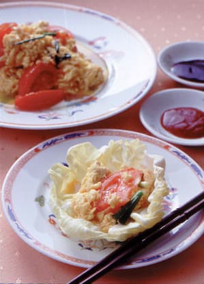 中華鍋をさっと拭いてサラダ油大さじ1をたし、強火で熱する。トマトを入れて塩少々を加え、少ししんなりするまで炒める。卵を戻し入れてあさつきを加え、ざっと炒め合わせて皿に盛る。キャベツの葉に、卵と好みでチリソースまたはオイスターソース適宜をのせ、包んでいただく。