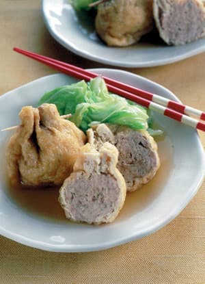 鍋にだし汁を入れて火にかけ、煮立ったら煮汁の残りの材料と、たねを詰めた油揚げを加えて中火で煮る。再び煮立ったら弱火にし、ふたをして約10分煮る。油揚げを端に寄せてキャベツを加え、ふたをして6~8分煮、キャベツがしんなりしたら火を止めて、煮汁とともに器に盛る。