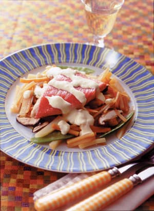 1の野菜の上に、白身魚、きぬさや、しいたけをのせ、ワインじょうゆを回しかける。ふたをして煮立ったら弱火にし、にんじん、じゃがいもが柔らかくなるまで5~6分蒸し煮にする。皿に盛り、にんにくマヨネーズをかける。