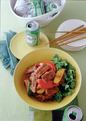 ボールにラップをかけ、電子レンジで8分ほど加熱する。取り出してピーマンを加えて全体を混ぜ、再びラップをかけて約7分加熱する。そのまま少し蒸らし、全体を混ぜる(もし、中まで火が通っていなければ、さらに2分ほど加熱する)。器に盛り、香菜を添える。