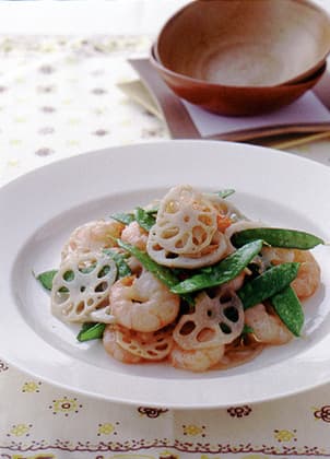 中華鍋にサラダ油大さじ1(大さじ2)を中火で熱し、れんこんを入れて2~3分炒める。れんこんが透き通ったら、強火にし、えび、調味料を入れて炒め合わせる。えびの色が変わったら、きぬさやを加え、1分ほど炒めて器に盛る。
