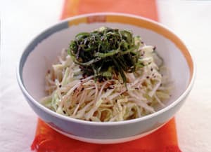 - 2野菜の水けをきり、ごぼうとキャベツをドレッシングであえて器に盛る。ごまを全体にふり、青じそをのせる。