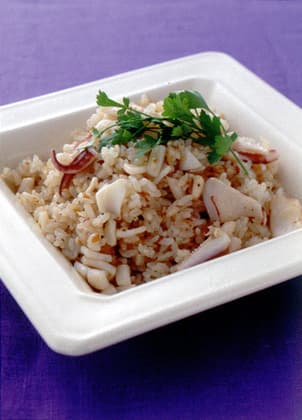 フライパンにオリーブ油を中火で熱し、アンチョビー、にんにく、赤唐辛子を炒める。香りが立ってきたら、いかを加えて白ワインをふり、炒める。ご飯を入れてほぐしながら炒め、塩、こしょう各少々(各少々)で調味する。器に盛り、あればイタリアンパセリを飾る。