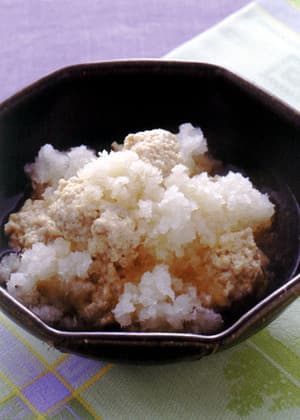 鍋に湯1カップを入れ、洋風スープの素をほぐして加える。酒大さじ2、塩小さじ1/4、みりん大さじ1を加え、鶏肉をスプーンですくい、丸く形をととのえながら加える。中火にしてアクを取り、7~8分煮る。鶏肉に火が通ったら、だいこんをまんべんなくのせて1~2分煮る。