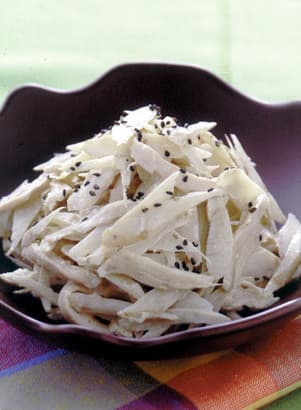 ボールに調味用の材料を混ぜ、ごぼうの汁けをきっていれ、鶏肉も加えてあえる。器に盛り、あれば、ごまをふる。