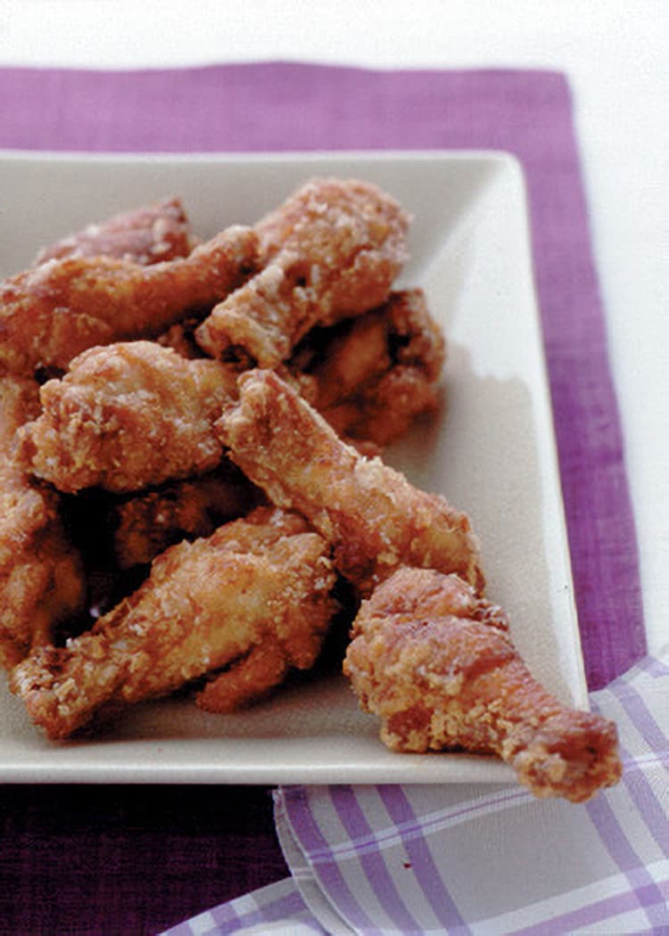 - 2手羽元の汁けをペーパータオルで拭き、片栗粉を薄くまぶしつける。揚げ油を中温(170~180℃。小麦粉を同量の水で溶いて数滴落とすと、鍋底近くまで沈んで、すぐに浮き上がる程度)に熱し、手羽元を入れて、菜箸で返しながら5~6分揚げる。最後に強火にしてからりと揚げ、油をきる。