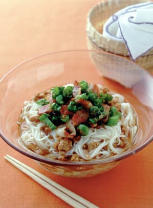 鍋に湯を沸かしてそうめんを入れ、袋の表示時間どおりにゆでる。ざるに上げ、流水の下で手早く洗い、水けをきって器に盛る。納豆を加えて全体をさっとあえ、ベーコンとしし唐をのせ、めんつゆをかける。