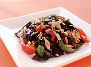 わかめは水洗いして水につけてもどし、水けを絞って幅3cmに切る。赤ピーマンはへたと種を取り、縦半分に切って幅1cmの斜め切りにする。ピーマンも赤ピーマンと同様に切る。ツナは缶汁をきって粗くほぐしておく。