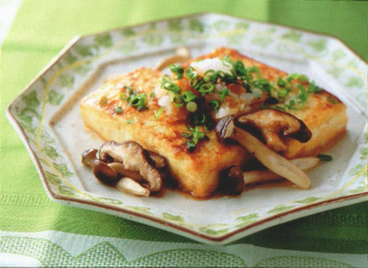 - 3【1】の豆腐をペーパータオルではさんで水けを拭き取る。フライパンを再び熱してサラダ油大さじ1をなじませる。豆腐全体に小麦粉を薄くまぶしつけ、フライパンに入れて中火で両面を焼きつける。みりん小さじ1、しょうゆ大さじ1を加えてからめ、器に盛る。【2】のきのこと大根おろしをのせて万能ねぎを散らし、好みでしょうゆ少々を落とす。