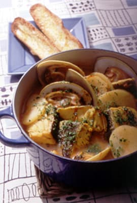 たらは、一切れを2つ~3つに切り、塩、こしょう各少々をふっておく。はまぐりは殻どうしを両手でこすり合わせて洗う。じゃがいもは皮をむき、厚さ2~3mmの薄い輪切りにする。