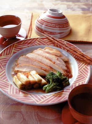 火を止めてたれを加え、鶏肉にからめる。再び中火にかけ、ねぎ、にんにく、赤唐辛子を加え、ふたをする。弱火にして4分ほど上下を返しながら焼き、汁けをきって器に移す。そのまま5~6分おいてさまし、縦に厚さ6~7mmに切る。残ったたれに鶏肉から出た肉汁を加え、2分ほど煮つめて器に敷き、鶏肉、ねぎ、ブロッコリーを盛る。