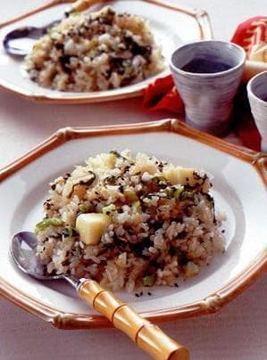 ご飯を加えて炒め合わせ、洋風スープの素小さじ1/2をふり、チーズを加えて全体に混ぜ合わせる。フライパンの縁から薄口しょうゆ小さじ2を加えて混ぜ、味をみて塩、こしょう各少々をふる。皿に盛り、黒いりごま適宜をふる。