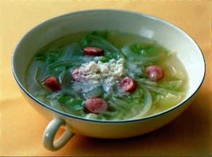 鍋に水2カップを強火にかけ、洋風スープの素をくずしながら入れる。ウインナソーセージ、玉ねぎ、キャベツを加え、3~4分煮たら塩、こしょう各少々で味をととのえる。器に等分に盛り、粉チーズ小さじ1ずつをふる。