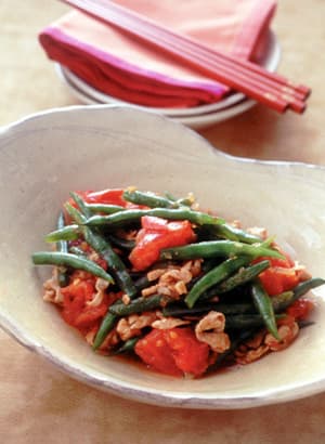 さやいんげんは塩少々を加えた熱湯に入れてさっとゆで、冷水にとる。粗熱が取れたら水けをきり、へたを切って2つ~3つに斜めに切る。トマトはへたをくりぬいて薄いくし形に切り、種を取り除く。玉ねぎはみじん切りにする。豚肉は幅5mmに切り、酒小さじ1、塩、こしょう各少々をふる。片栗粉小さじ1/2を水小さじ1/2で溶いて水溶き片栗粉を作る。