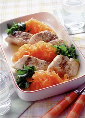 にんじんの入ったボールにさわらを加えて全体をあえ、1~2分漬ける。さわらとにんじんを皿に盛り、あればクレソンを添える。