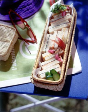 3.のサンドイッチを重ねてラップでくるみ、冷蔵庫で30分ほどねかせてなじませる。包丁をパンの角に当てるように斜めに傾けて入れ、手でパンを押さえながら、そのままの角度で細かく動かし、みみを切り落とし、縦、横に4等分に切る。容器に詰め、きゅうりと、あれば、みょうが、好みのハーブ、桜の花の塩漬けを添える。
