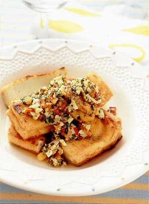 焼き厚揚げのガーリックベーコンソースがけ