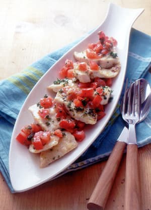 めかじきは一切れを3つ~4つのそぎ切りにし、塩、こしょう、小麦粉各適宜を順に両面にふる。トマトは縦半分に切ってへたを取り除き、1cm角に切る。マリネ液の材料を混ぜ合わせる。