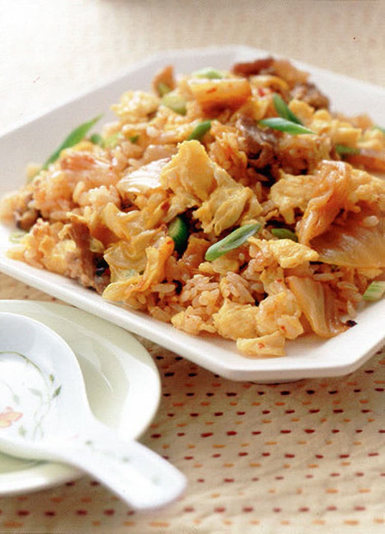 フライパンにサラダ油、ごま油各大さじ1/2を入れて中火で熱し、溶き卵を流し入れて菜箸で大きく混ぜ、半熟状になったら取り出す。フライパンにサラダ油、ごま油各大さじ1/2をたして中火で熱し、豚肉を炒める。肉の色が変わったらキムチを加えてまんべんなく炒め合わせる。