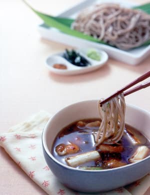 そばは袋の表示どおりにゆで、流水で洗って水けをきり(下記参照)、皿に盛る。七味唐辛子、のり、おろしわさびを添え、そばをつゆにつけていただく。