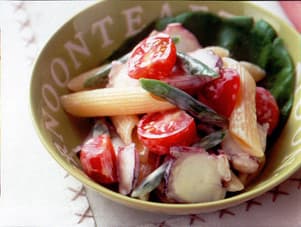 ボールにドレッシングの材料を入れて混ぜ合わせ、たこ、いんげん、プチトマト、ペンネを入れて混ぜ合わせる。器にサラダ菜を敷き、サラダを盛る。