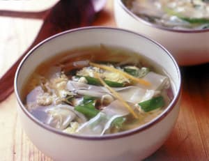 鍋に熱湯2カップを沸かし、鶏ガラスープの素小さじ2を入れる。1.の野菜をすべて加え、2~3分煮てしんなりとしたらしょうゆ小さじ1、塩小さじ1/2、こしょう少々を加える。味をみて、ワンタンの皮を加え、約1分煮る。溶き卵を回し入れ、固まったらごま油小さじ1を加える。