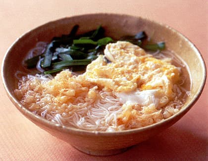 そうめんを器に等分に入れ、にら、卵を1/2量ずつのせる。残った煮汁をかけ、揚げだまを1/2量ずつのせる。