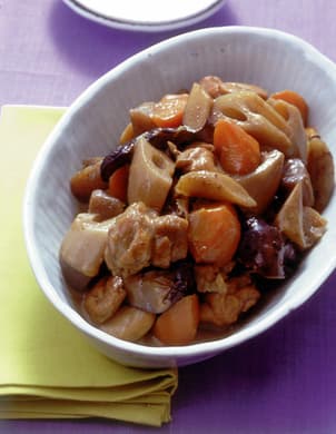 鍋にサラダ油大さじ1を入れて中火で熱し、鶏肉を入れて表面に焼き色がつくまで焼く。ごぼう、れんこん、にんじん、しいたけ、こんにゃくを加えて炒め、全体に油が回ったら酒大さじ3を入れて水1カップを加える。