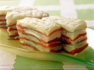 缶詰などをのせて重しをし、冷蔵庫で約10分おく。底に敷いたラップの端をひっぱるようにして、ラップごと取り出し、食べやすい大きさに切って器に盛る。