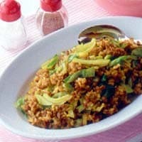 同じフライパンにサラダ油大さじ1をたして弱火で熱し、にんにくを入れて炒める。香りが立ったらひき肉を加えて炒め、肉の色が変わったらご飯を加えてほぐしながら炒める。全体に油が回ったらキャベツを戻し入れ、カレー粉大さじ3~4、薄口しょうゆ(なければしょうゆ)大さじ2、塩小さじ1/2をふってひと混ぜする。
