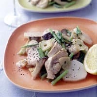 塩、粗びき黒こしょう各少々をふり、ふたをして弱火にし、5~6分蒸し煮にする。ふたを取り、白ワインをふり入れて強火にし、汁けがなくなるまで炒める。器に盛り、レモンを絞りかけていただく。