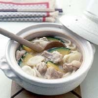 - 2鍋にだし汁3カップと、しょうがのすりおろし小さじ1/2、鶏肉を入れて、アクを取り除きながら中火で10分煮る。さらにうどん、かぼちゃ、ねぎを加えて5分煮たあと、みそ大さじ2を溶き入れる。 (1人分394kcal、塩分3.1g)