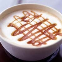器にインスタントコーヒー大さじ1、湯1/2カップを入れて混ぜ合わせる。2.の牛乳の1/2量を注ぎ、スプーンでキャラメルクリームを格子を描くようにしてかける。同様にもう1つ作る。