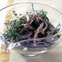 - 1春菊1/2わ(約70g)は葉先の柔らかい部分を摘む。新玉ねぎ1/4個は縦に薄切りにして冷水にさらし、パリッとしたらざるに上げて、水けをきる。