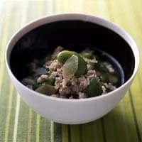 - 2鍋にサラダ油小さじ2を中火で熱し、鶏ひき肉120gを入れて、ほぐすようにして炒める。ポロポロになったらだし汁2カップを注ぎ、皮をむいたしょうがの薄切り2~3枚、みりん大さじ2、砂糖大さじ1、塩小さじ1/2、薄口しょうゆ(なければしょうゆ)小さじ2で調味する。煮立ったらそら豆を加え、さっと煮る。 熱量225kcal、塩分2.5g(1人分)