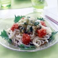 - 2うどんはたっぷりの熱湯で袋の表示時間どおりにゆで、手早く水洗いして水けをきる。 器に飾り用のしそを敷いてうどんを1/2量ずつ盛る。混ぜ合わせた大根おろしとしそ、明太子を等分にのせ、つゆをかける。 (1人分371kcal、塩分5.9g) ※めんつゆは2倍希釈のものを基準にしています。ただし、メーカーによって塩分などに違いがあるので、味を見ながら加減してください。3倍希釈の場合はめんつゆ1/3カップ+水大さじ2にして。