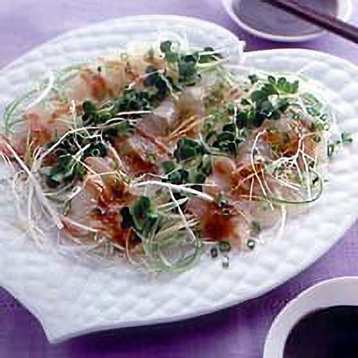 鯛にねぎと貝割れ、しょうがを添えてあさつきを散らす。全体にレモン汁をふり、合わせ調味料をかける。