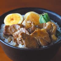 煮立ったら弱めの中火にし、ときどき上下を返しながら5分ほど煮る。きぬさやを加え、さっと煮て火を止め、煮卵を取り出して横半分に切る。器にご飯を等分に盛り、煮豚、煮卵、きぬさやを1/2量ずつのせて煮汁を回しかけ、練り辛子少々を添える。