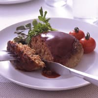 全体がふっくらとしたら、ハンバーグの真ん中に竹串を刺してみる。赤い肉汁が出てこなければ裏返して強火にし、ふたをせずに30秒~1分焼いて火を止める。器に盛ってソースをかけ、プチトマト、クレソンを添える。