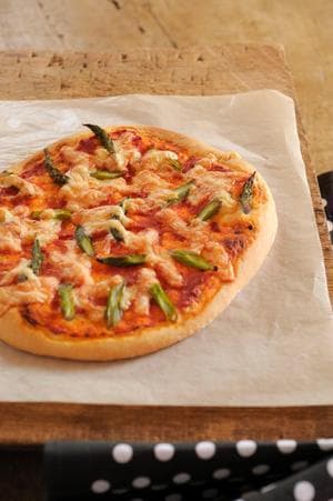 フォークで生地にまんべんなく穴をあけて、ピザソースの1/2量を塗ってアスパラガスの1/2量を並べ、ピザ用チーズの1/2量を散らして天板にのせる。200℃のオーブンで、端がきつね色になるまで20分ほど焼く。残りも同様に焼く。